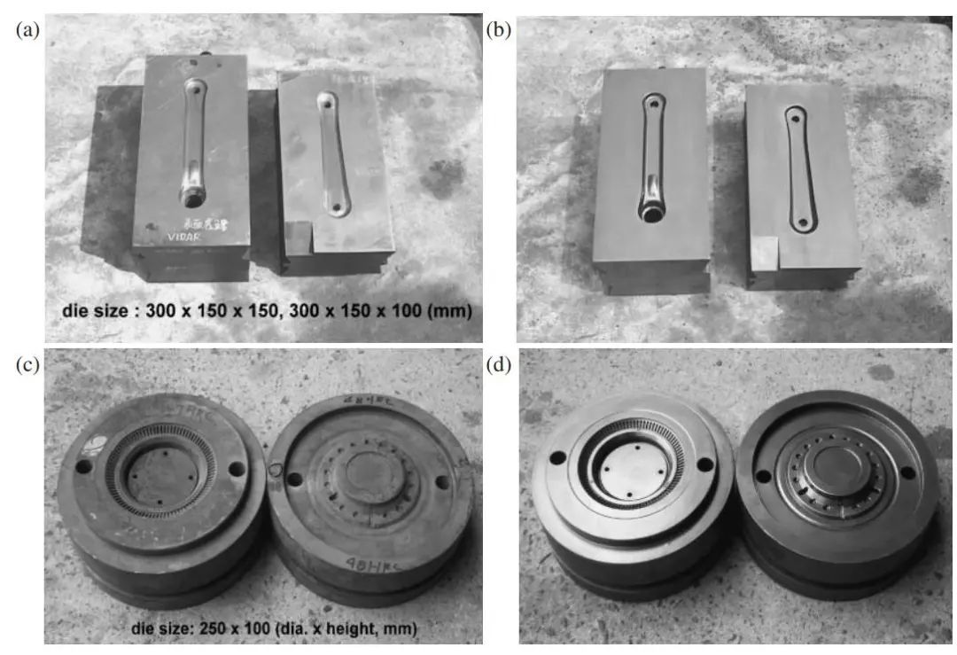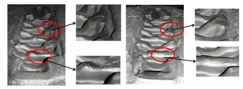 對比曲軸熱鍛模未噴丸(左)和噴丸后(右)在服役8000模次后的表面形貌。可見未噴丸的模具出現了嚴重的磨損和變形,而噴丸后的模具僅在一些邊緣的部位出現輕微的磨損,損壞程度遠小于未噴丸的模具。